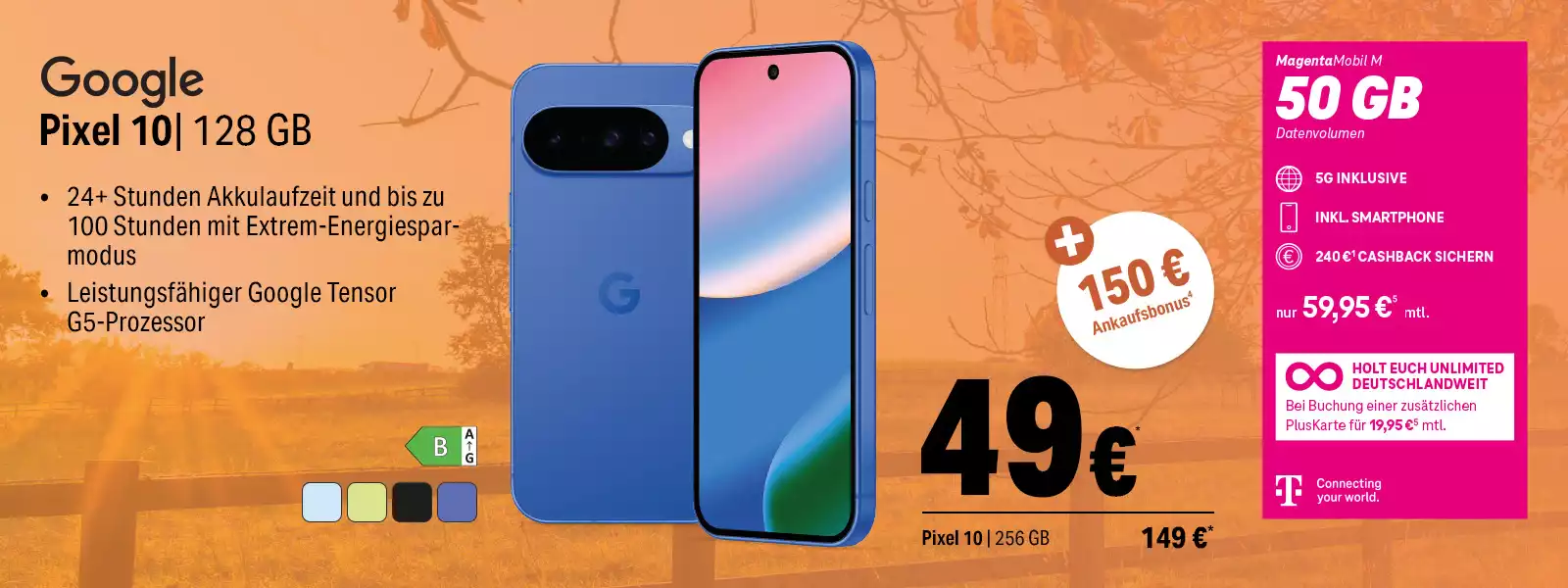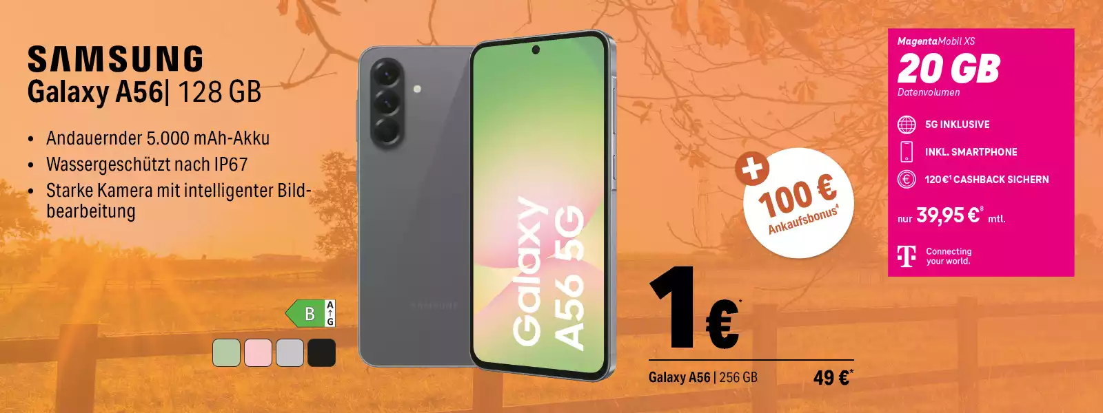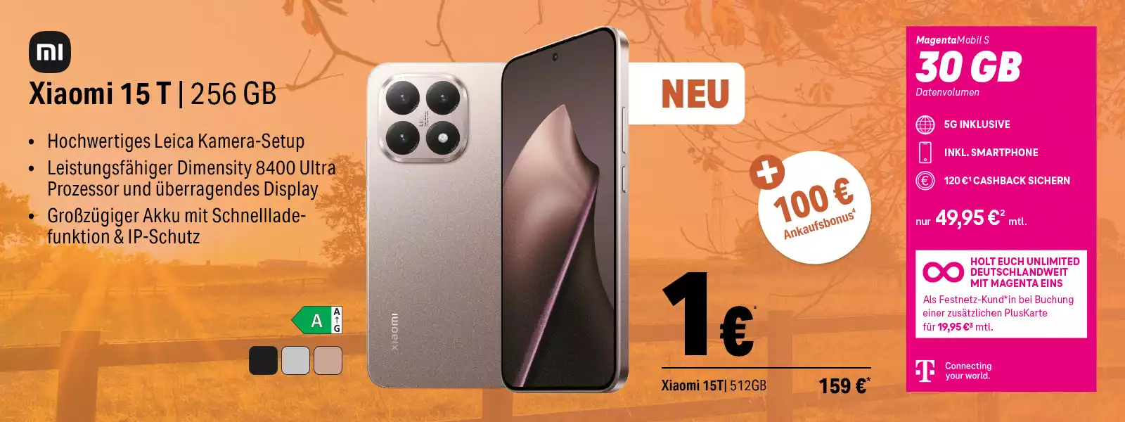 4) Der Ankaufsbonus gilt für private Endkunden ab 18 Jahren bei Kauf eines der Smartphone Modelle Samsung Galaxy A56 oder Google Pixel 10 vom 19.09.2025.-31.12.2025 oder bei einem Xiaomi 15T vom 24.09.–31.12.2025 bei der Telekom Deutschland GmbH (TDG) und bei zusätzlichem Verkauf eines teilnahmeberechtigten Smartphones an die Assurant Deutschland GmbH. Das Handyankaufsangebot für das Altgerät muss bis zum 31.12.2025 generiert werden. Das Altgerät muss bei Kauf eines Xiaomi 15T bis zum 31.12.2025 und bei einem Samsung Galaxy A56 oder Google Pixel 10 bis zum 21.01.2026 bei der Assurant Deutschland GmbH bzw. ihrem Dienstleister eingegangen sein. Teilnehmer erhalten ein Ankaufsangebot für das Altgerät zzgl. eines Ankaufsbonus. 100 € Ankaufsbonus gibt es beim Kauf eines Xiaomi 15T oder eines Samsung Galaxy A56, 150 € Ankaufsbonus beim Kauf eines Google Pixel 10. Das Altgerät muss funktionsfähig sein, d.h. es muss ein- und ausschaltbar sowie entsperrt (kein SIM-/Net-Lock) sein, darf keinen Wasserschaden oder Displaybruch aufweisen und muss einen Mindestankaufswert von 1 € haben. Teilnahme mit max. 3 Aktionsgeräten pro Haushalt. Solange der Vorrat reicht. Die Teilnahmebedingungen befinden sich unter www.telekom.de/handyankauf.