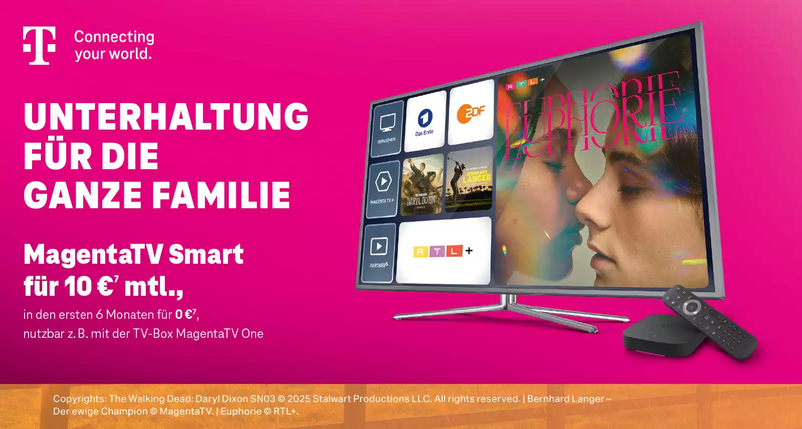 7) Aktion gilt bis 02.02.2026 für MagentaTV Neukunden. MagentaTV Smart kostet in den ersten 6 Monaten 0 €/Monat, danach 10 €/Monat. Mindestvertragslaufzeit 24 Monate. MagentaTV ist über die MagentaTV App ohne zusätzliche Hardware empfangbar. Auf Wunsch kann die TV-Box MagentaTV One für 5 €/Monat, zzgl. 6,95 € Versandkosten, mit einer Mindestvertragslaufzeit von 12 Monaten gemietet werden. Alle Preise inkl. der gesetzlichen MwSt. Voraussetzung für die Nutzung ist eine bestehende Internetverbindung. Für die Internetverbindung gelten die Bedingungen des jeweiligen Internetanbieters. Bei Nutzung über das Mobilfunk-Datennetz erfolgt die Belastung des Datenvolumens beim jeweiligen Mobilfunk-Anbieter.